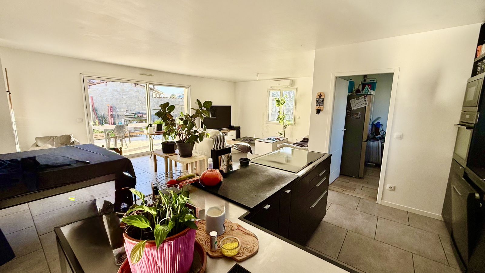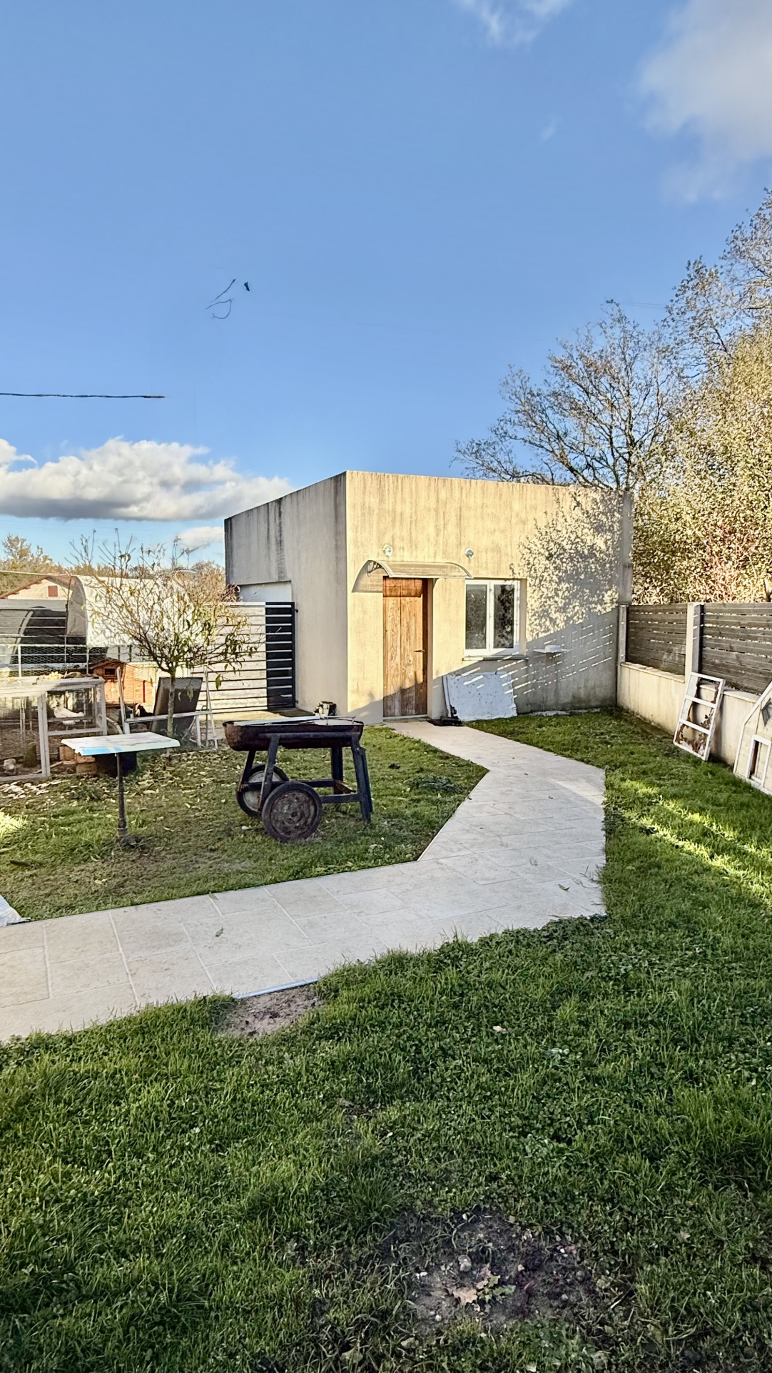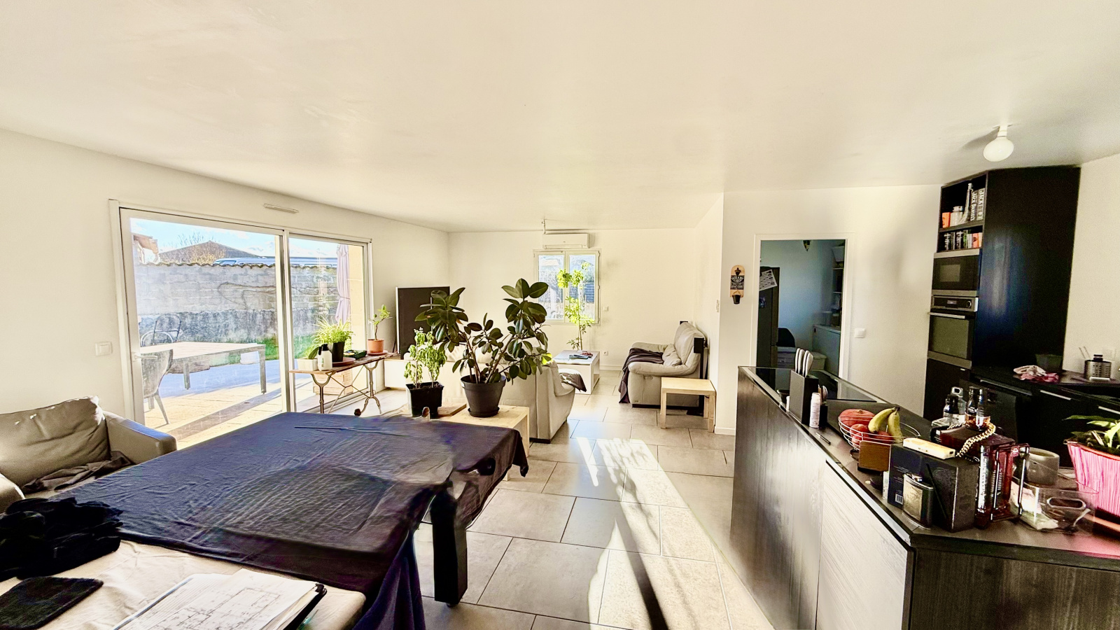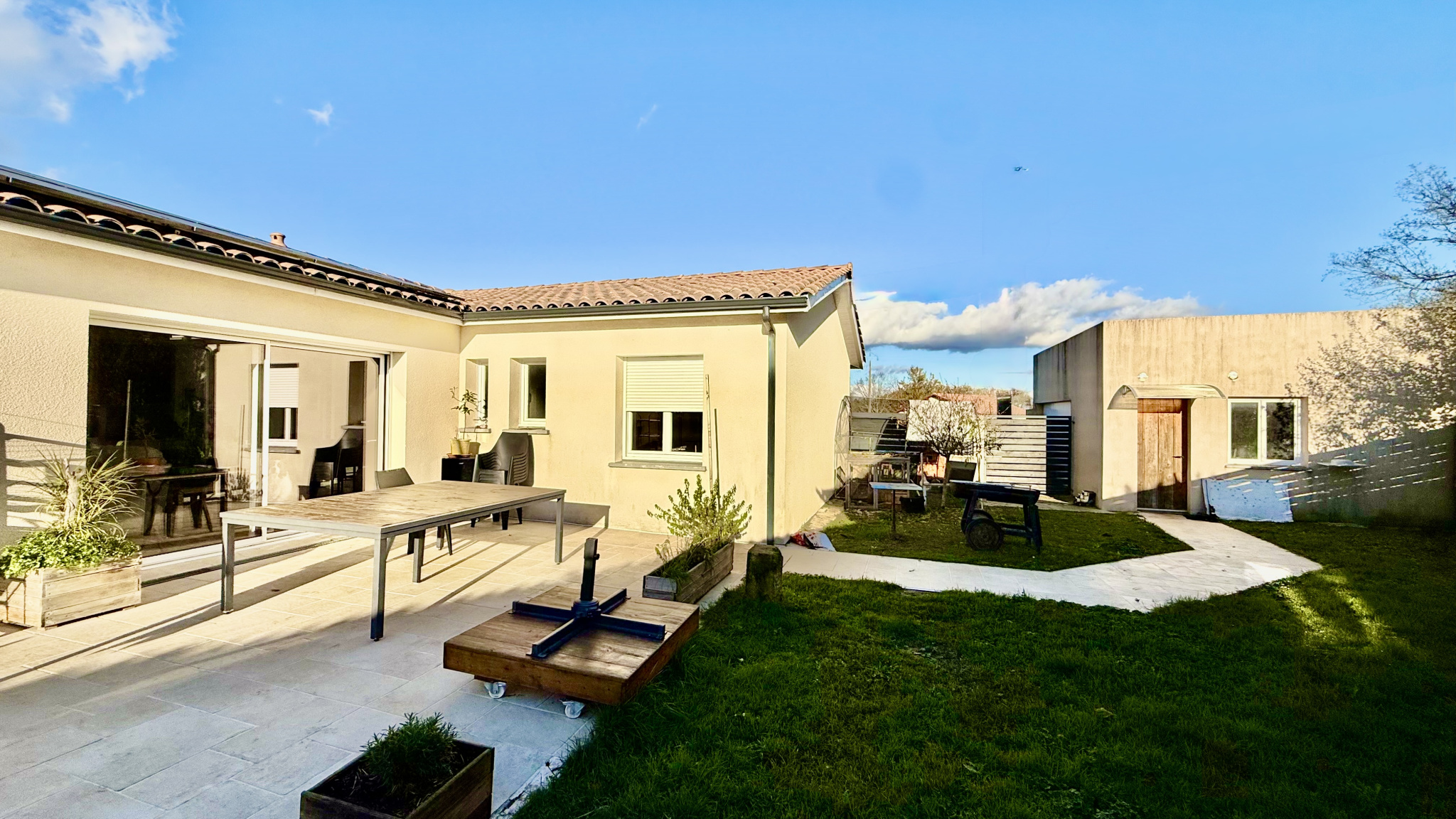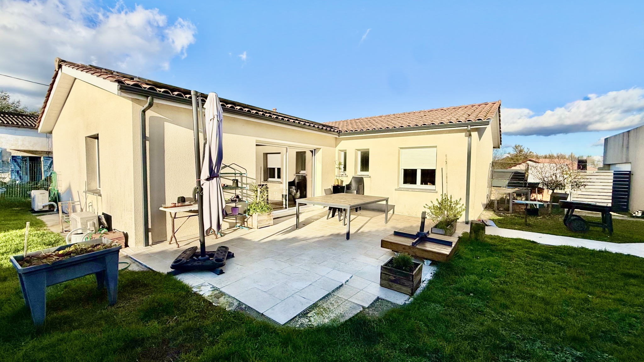 Aux portes de Bazas maison de plain-pied de 125 m² construite en 2016. Elle se compose d'une pièce de vie avec cuisine ouverte et équipée, 4 chambres dont une suite avec dressing et salle d'eau, deuxième salle de bains indépendante avec douche et baignoire, WC séparé, cellier.