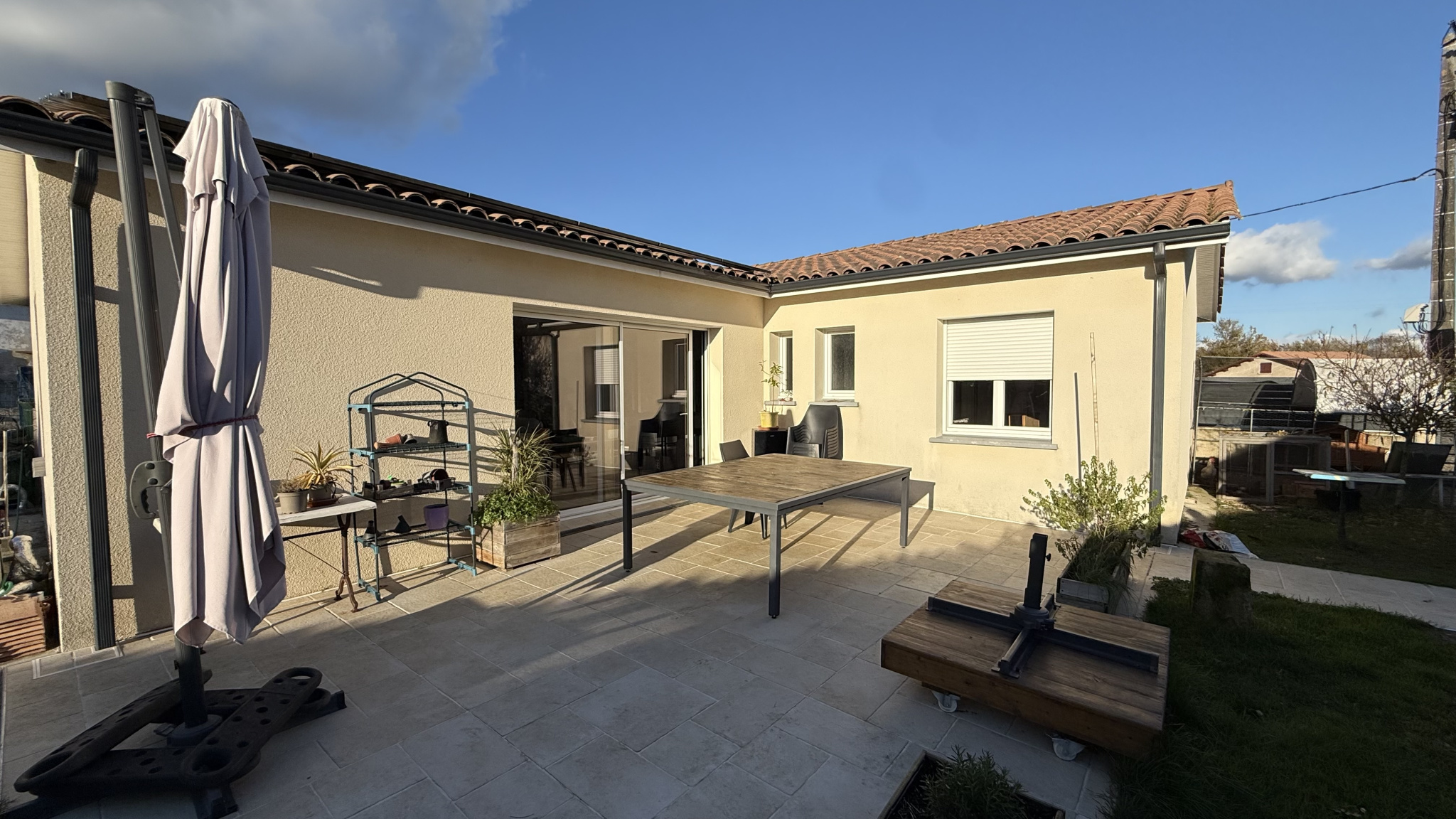Depuis le salon, on accède à une belle terrasse par une grande baie vitrée. Garage. Portail électrique.
