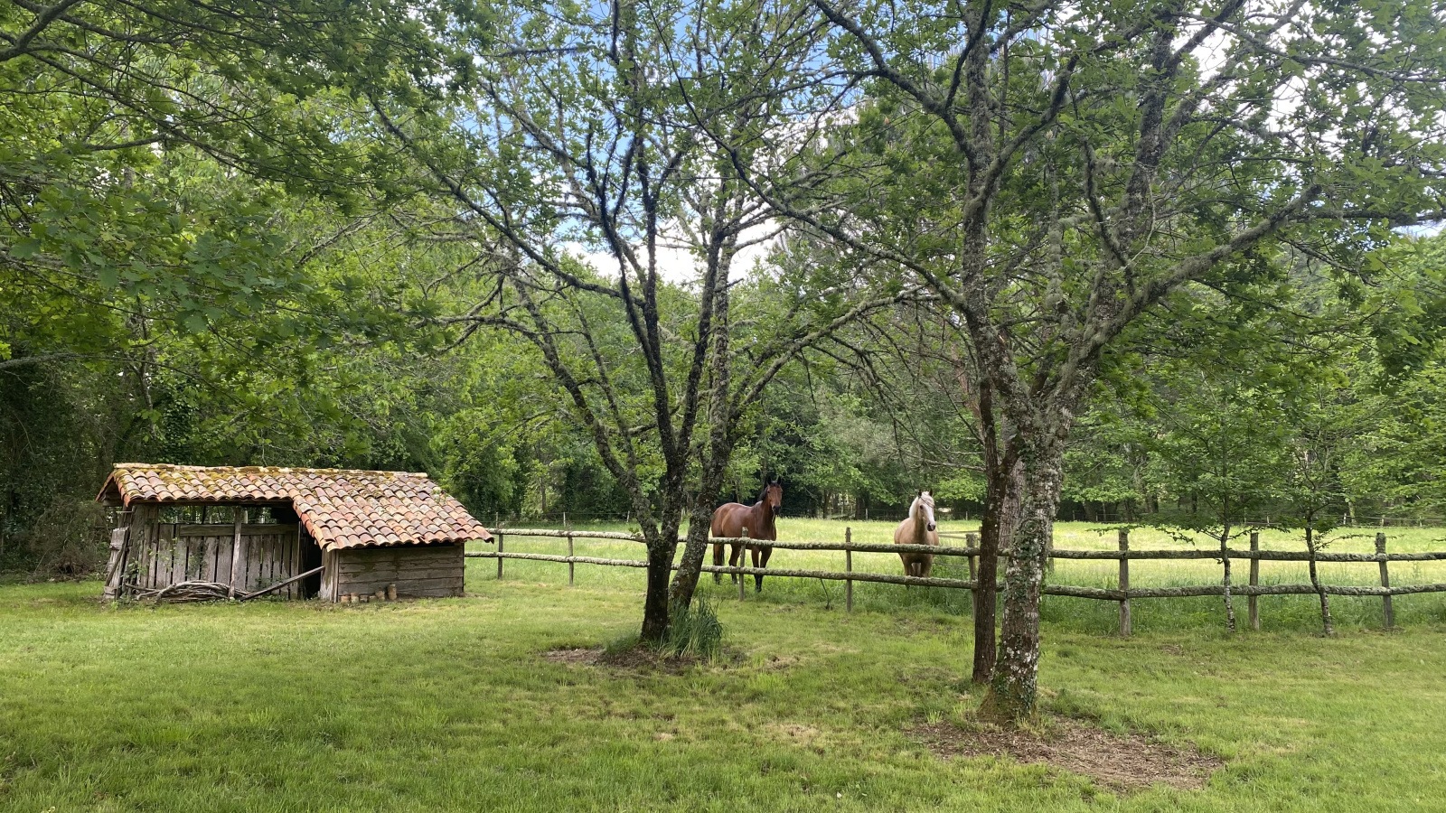 Les 11ha se composent de bois de feuillus et de pins, d'un verger de 3000m2, de plusieurs paddocks équipés d'abreuvoirs, de prairies et une carrière.