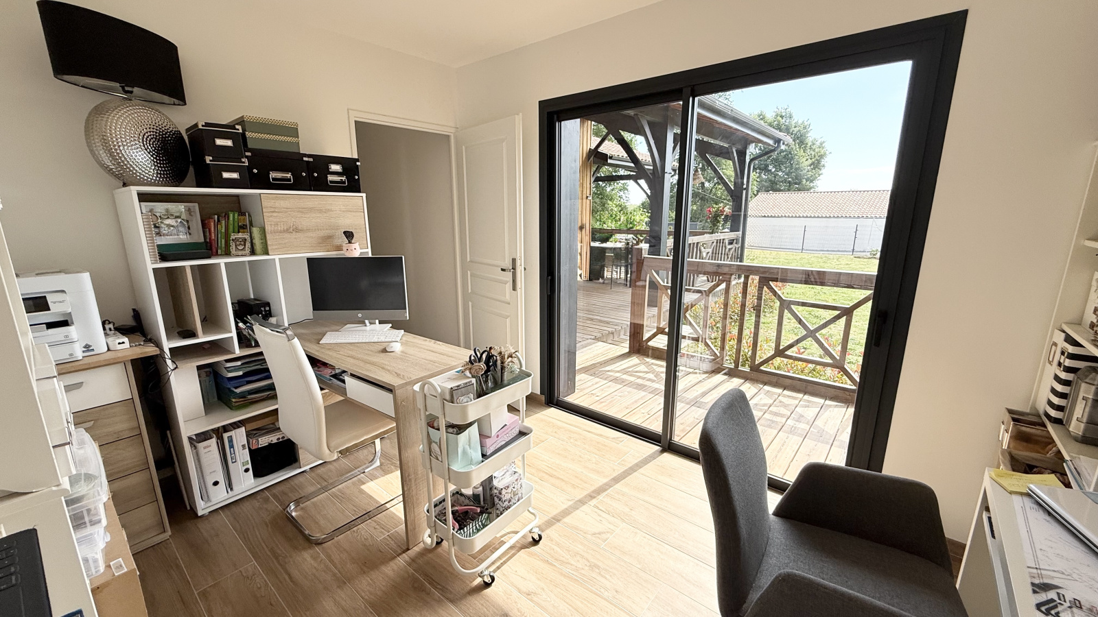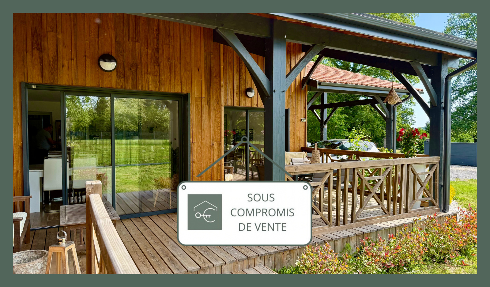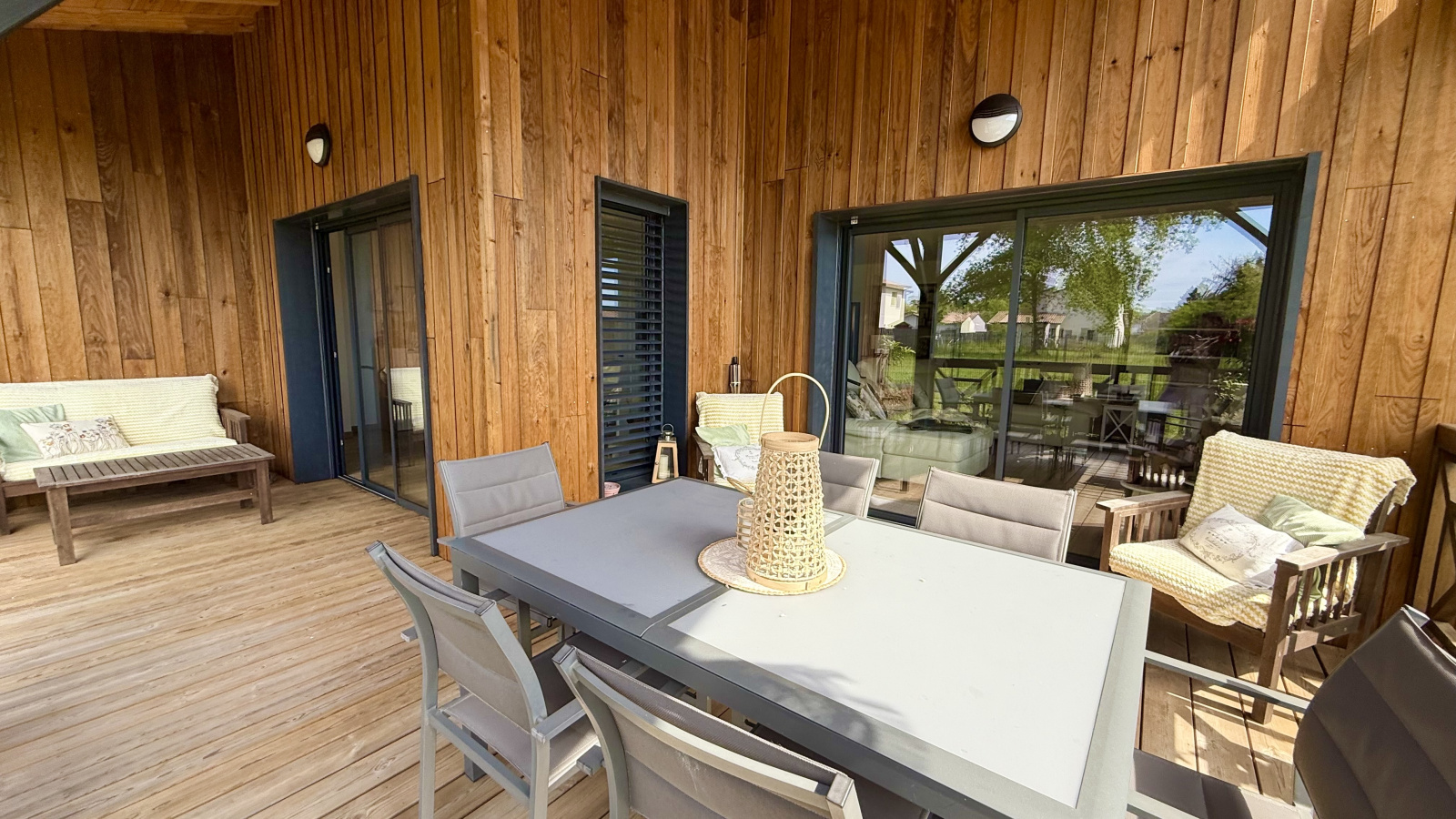 Terrasse et carport 2 voitures à l'avant de la maison.