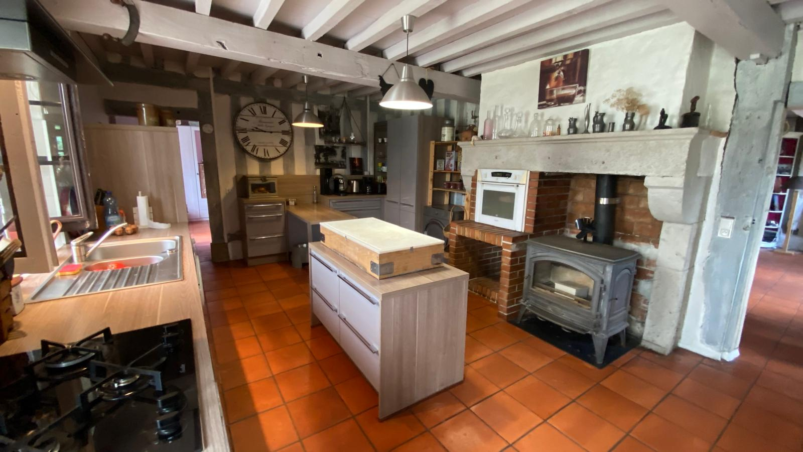 Elle se compose d'un grand auvent qui donne sur une grande pièce de vie avec cheminée (poêle à granules recemment installé), cuisine équipée avec poêle à bois donnant sur une véranda, 4 chambres, salle de bain et salle d'eau, WC indépendant.